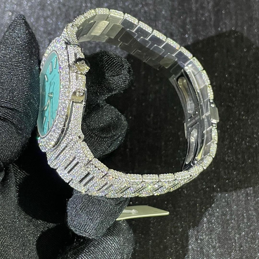 Patek Philippe Nautilus Tiffany VVS Round Moissanite Diamond Iced Out Watch, Stainless Steel Hip Hop Jewelry Watch For Birthday Gift, White Gold Plated VVS Round Moissanite Diamond Watch